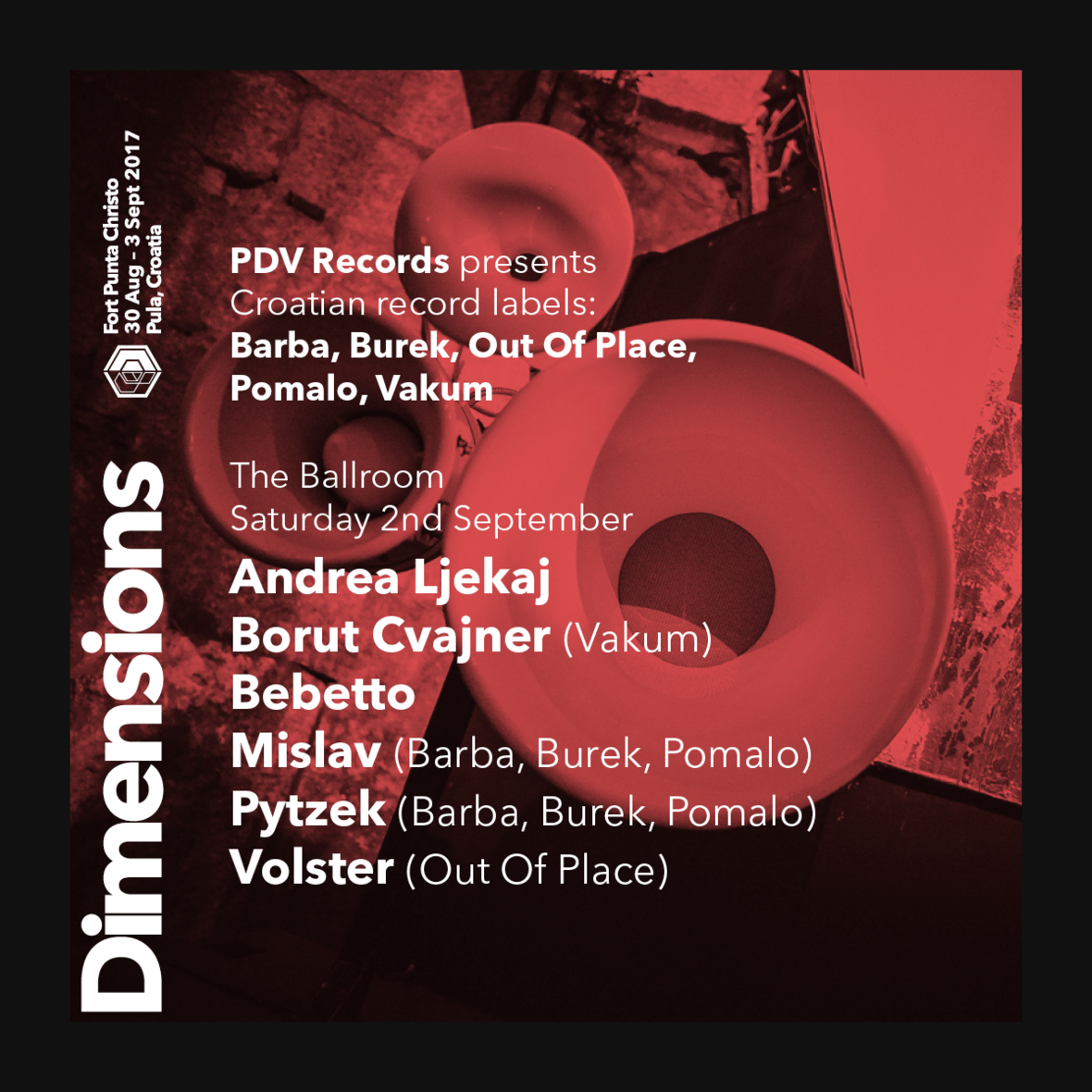 U režiji domaće etikete PDV 2. rujna na The Ballroom pozornici predstavit će se hrvatske izdavačke kuće: Barba, Burek, Out Of Place, Pomalo i Vakum nošeni njihovim najboljim igračima kao što su Andrea Ljekaj, Borut Cvajner, Bebetto, Mislav, Pytzek i Volster. Uzlet regionalne elektroničke scene pokazat će zagrebački kolektivi ekstrakt i CFSN, srpski predstavnici Avoid, Mikadroid i Nikola Vemić te Roli iMarta iz Slovenije.