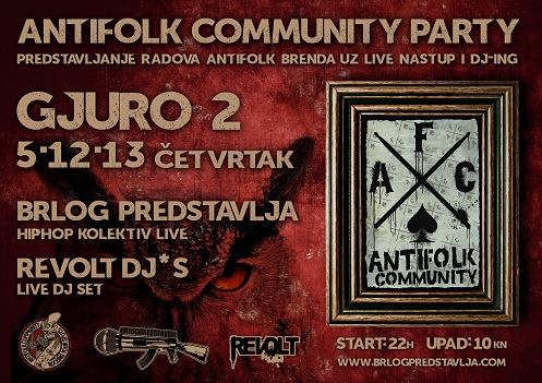Pozivamo vas u četvrtak 05.12. u zagrebački klub Gjuro 2, gdje će se održati predstavljanje udruge AntiFolk Community te njezinih radova iza kojih stoji mladi graffiti umjetnik iz Valpova koji djeluje pod imenom MOR. Kao glazbena podrška nastupit će Brlog Predstavlja iz Slavonskog Broda, te Mefa iz Revolt DJ’s kolektiva. Također, napominjemo da će...