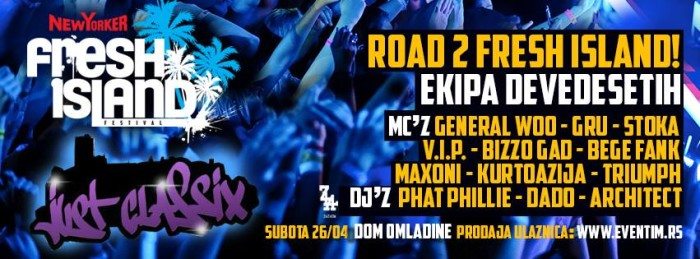 Stoka, Gru, General Woo, V.I.P., Bizzo Gad, Dj Phat Phillie, Bege Fank, Maxoni, Triumph, Kurtoazija, Dj Don Dado, Dj Architect, Dj Munja uživo 26.04. u Domu Omladine Beograda na velikom Fresh Island Festival Promo koncertu! Just Classix vas poziva na službeni beogradski party New Yorker Fresh Island festivala. Pokrenut u 2012, New Yorker Fresh...