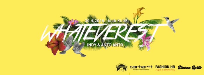Novi Whateverest event je na rasporedu je večeras, 30. travnja, u klubu Klub. Gramofone će i ovoga puta zauzeti provjereni resident duo: DJ Indy i Anto Anto. Očekuje vas jedinstveni miks trapa, hip hopa, R&B-a, housea i footworka, uz još poneko glazbeno iznenađenje. Vrijedi napomenuti kako je i sutra petak, 1. svibnja, neradni dan. U...